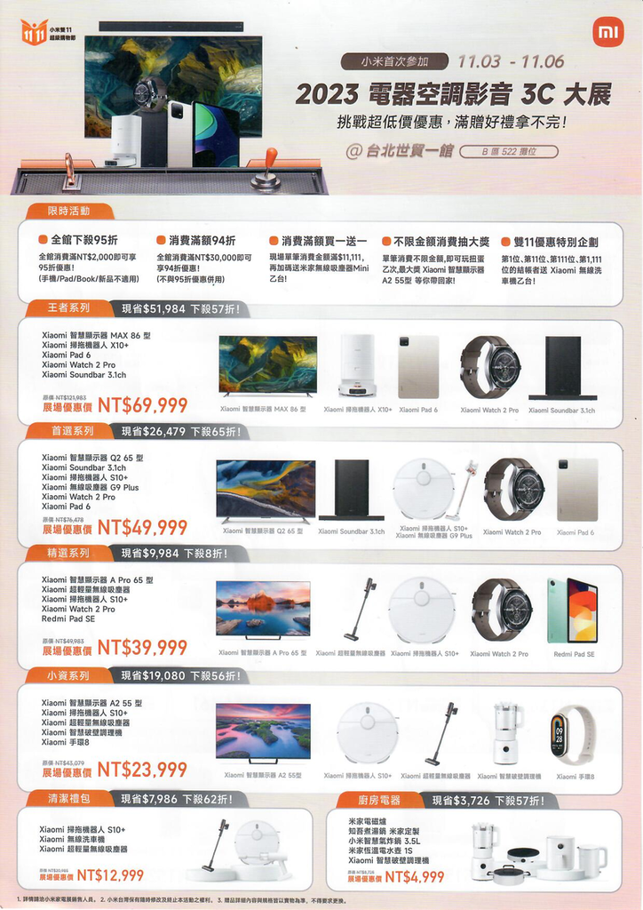 限時四天!小米在 11/3~11/6 台北世貿中心展覽一館「2023 電器空調影音 3C 大展」推出超殺首展特惠