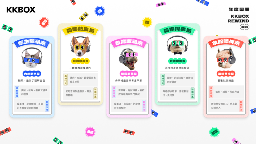 年度回顧首先邀請用戶選擇專屬的「音樂人格」。KKBOX 根據不同的聆聽習慣和音樂品味,設計了五種「動物聽歌系」代表頭像供用戶挑選,包含: