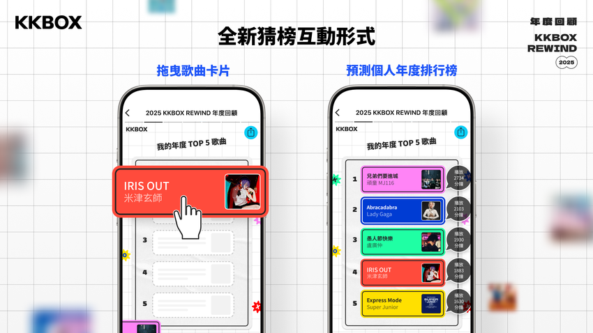 今年新增了有趣的互動環節,用戶可以在檢視「我的年度 TOP 5 歌曲」時,先自行拖曳歌曲卡片來猜測自己的年度愛歌排行榜順序,最後再由系統依據實際聆聽數據揭曉真實的歌曲排名,增添了挑戰性與驚喜感。